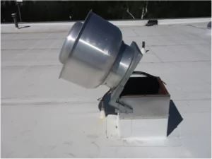 The Exhaust Fan pulls the air out of the kitchen, through the ductwork and into the air outside the building. Exhaust fans come in various makes and models but all function to remove grease vapor and exhaust from the surfaces of the cooking equipment. The exhaust fan is usually found on the rooftop of the building but can also be placed on the side of a wall or inside a Pollution Control Unit (PSU). A PCU pulls even more grease and sometimes odor out of the exhaust air. PCU’s are generally found in city centers or metropolitan areas where the exhaust could potentially come into contact with nearby people passing by the building.