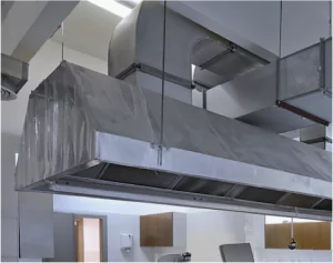 The Hood is the most obvious and noticeable part of the kitchen exhaust system. The hood is located directly above the cooking equipment, hanging over the stove or fryer and above the cook’s head. The hood collects all the heat and incoming grease vapors being produced from the cooking equipment. Inside the hood, baffle-filters collect and filter the grease vapors before they enter the ductwork. This makes it so less grease finds its way into the ductwork and thus gets expelled into the air outside the building.