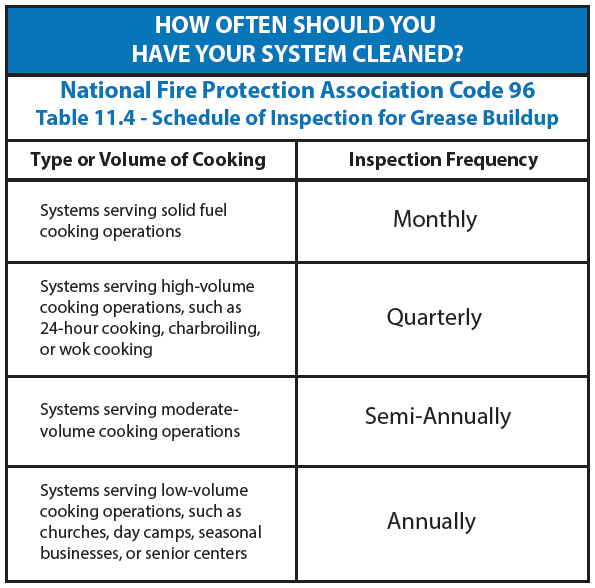 When your cooking equipment isn’t properly cleaned, it allows grease residue to build up, creating a fire hazard inside of the hood, ductwork, and exhaust fan. If a fire was to occur on the cook line, all of these grease deposits allow the fire to spread to these portions of the building. To prevent this fire risk you MUST remove the grease deposits. How often you should clean your system depends on the type of cooking operation your business or organizations are and how often you use those appliances. Table 11.4 below from NFPA Code 96 details the minimum standards on how often your kitchen exhaust system should be professionally cleaned based on cooking volume: